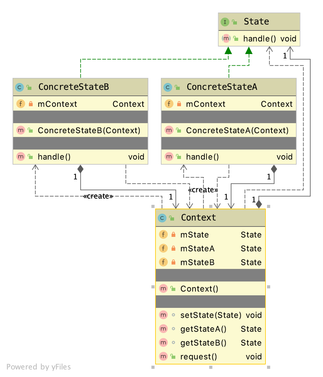 状态模式可以有不同的写法,这里是在 Context 中为每种状态维护了一个实例,也可以把具体状态写成单例模式。